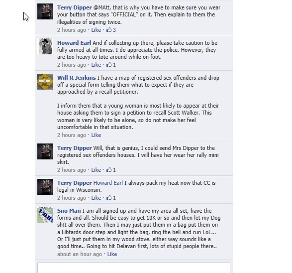 Untitled Tea party discussing conducting voter fraud on Facebook. (via Wisconsin Tea Party Members Claim They’re Collecting Petitions For Walker Recall – So They Can Destroy Them | Crooks and Liars) By Stable Genius I am the very model of a Stable Genius Liberal. View all of Stable Genius's posts.