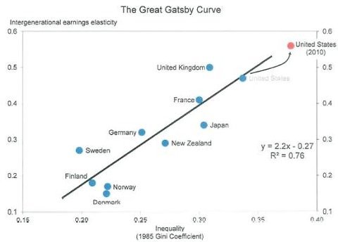 America is both especially unequal and has especially low mobility. But he also argues that because we are even more unequal now than we were a generation ago, we should expect even less social mobility going forward. Very illuminating — and disturbing. (via The Great Gatsby Curve – NYTimes.com)