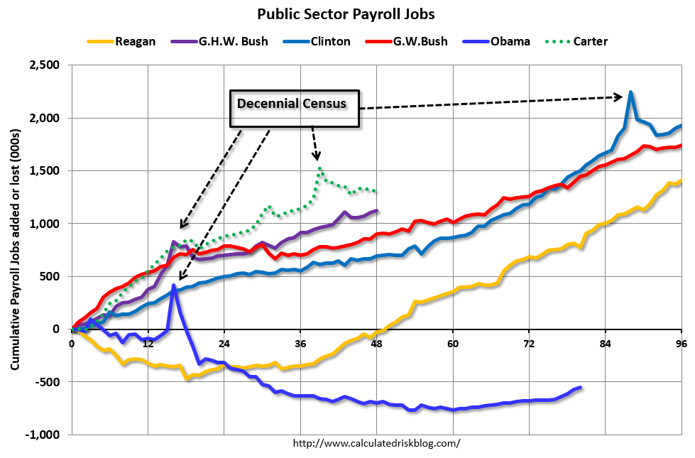 When you look at the purple line on the bottom that shows the size of the federal government during the Obama years, does it look like “unprecedented growth” or “rapid, unchecked expansion” ?