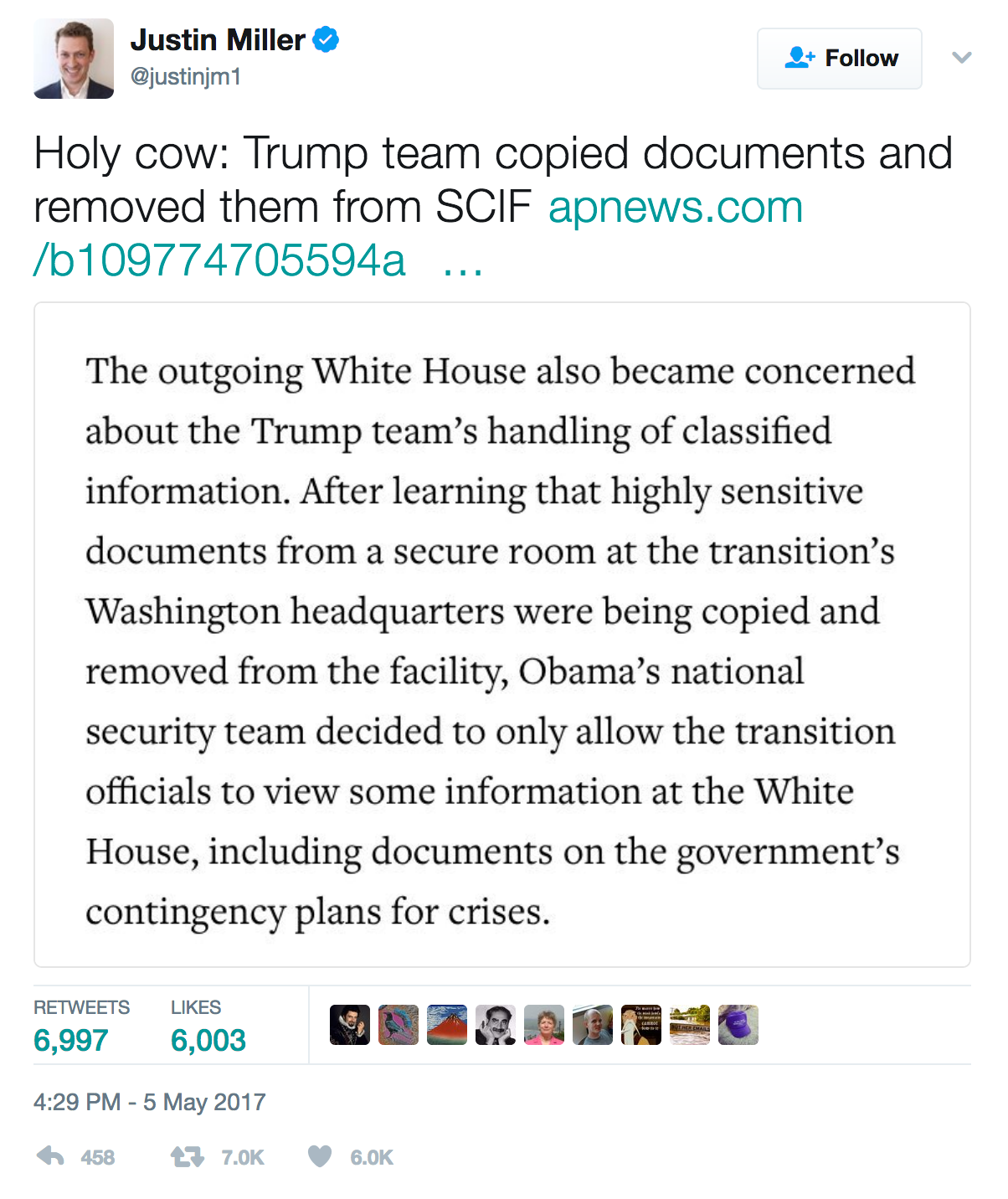 Remember six month ago when the Trump team claimed that Hillary needed to be locked up because her actions might have lead to the mishandling of sensitive information? They were mishandling sensitive during the transition.