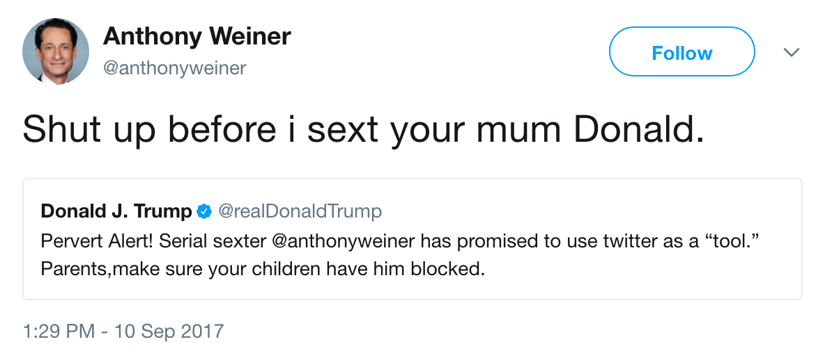 Untitled Trump being trolled by a fake Anthony Weiner. He should challenge him to a pussy grabbing contest. By Stable Genius I am the very model of a Stable Genius Liberal. View all of Stable Genius's posts.